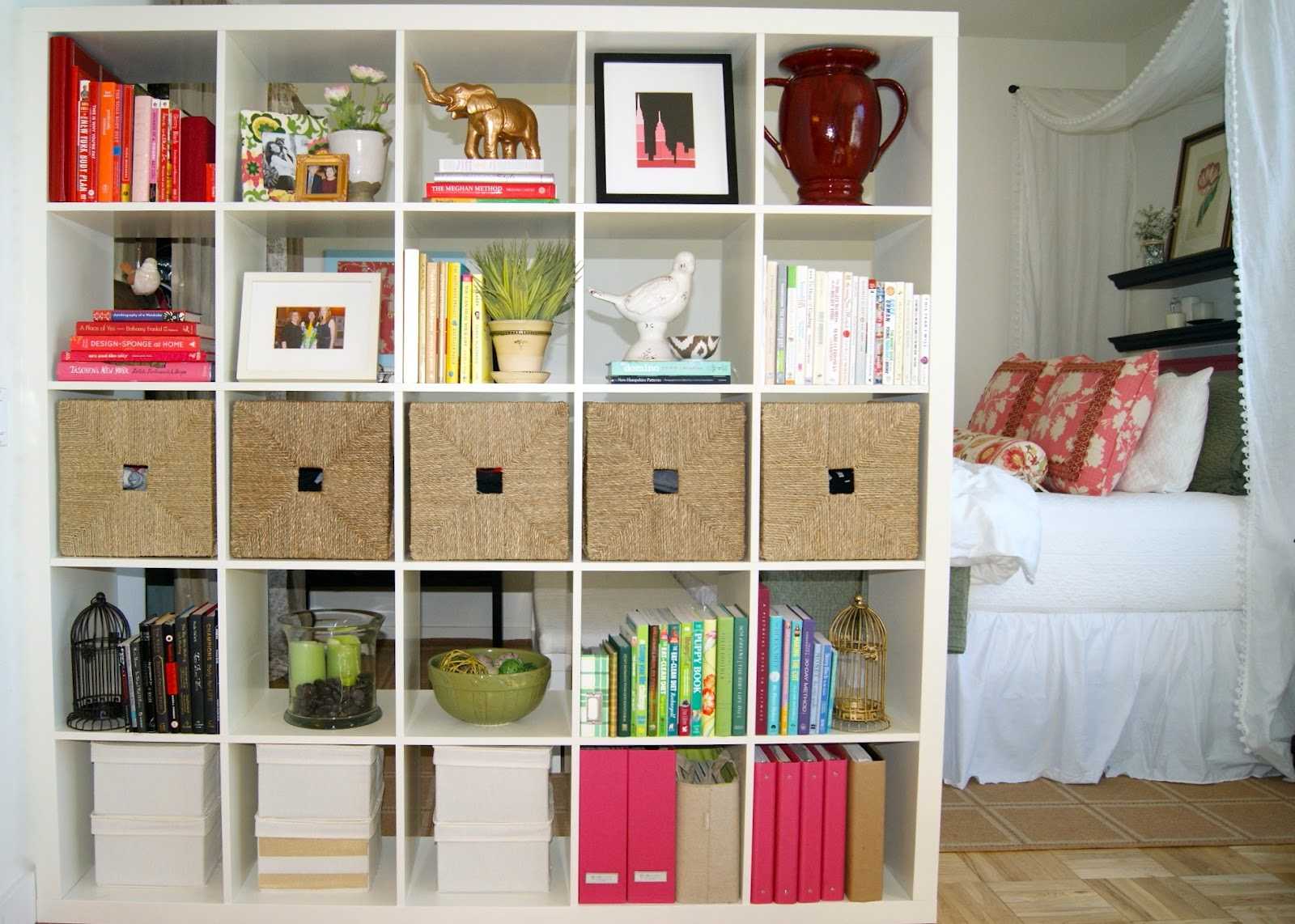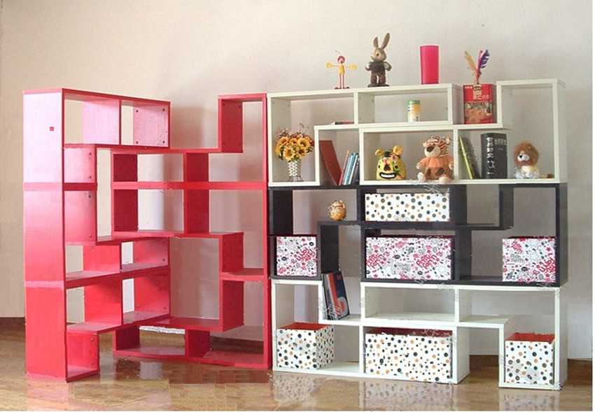 - Стеллаж перегородка (легкий вариант зонирования, удобно доставать вещи, эффективно использовать, например, в детской комнате).