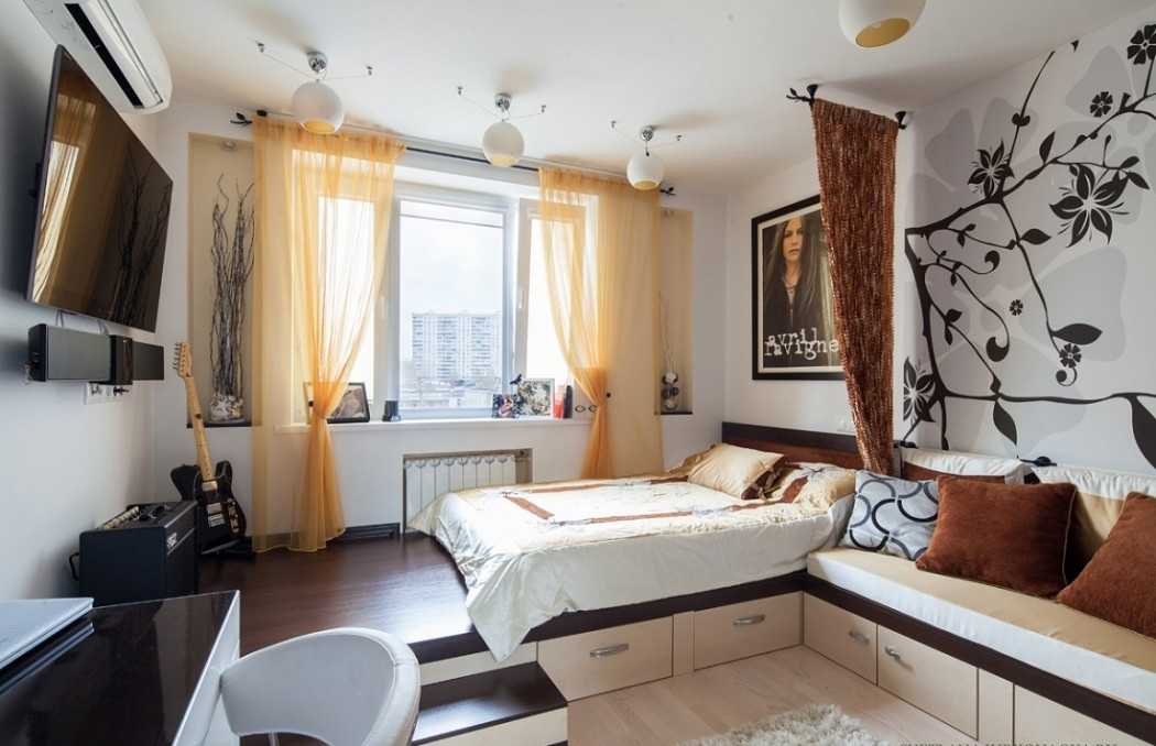 Начнем с того, что в данном случае считать маленькой комнатой. Вообще, считается что комната площадью 14-16 метров немаленькая. Но в случае с необходимостью размещения двух зон — гостиной и спальни — это действительно очень немного. Вот такие помещения — до 16 квадратов и будем принимать как маленькие. Если площадь 18-20 метров и больше, это уже «нормальные» размеры, в которых гостиная спальня может быть разделена с использованием любых приемов зонирования.
