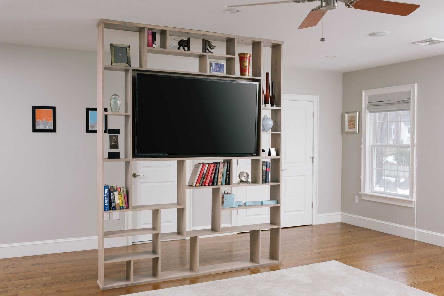Такая перегородка с телевизором очень удобна и функциональна.