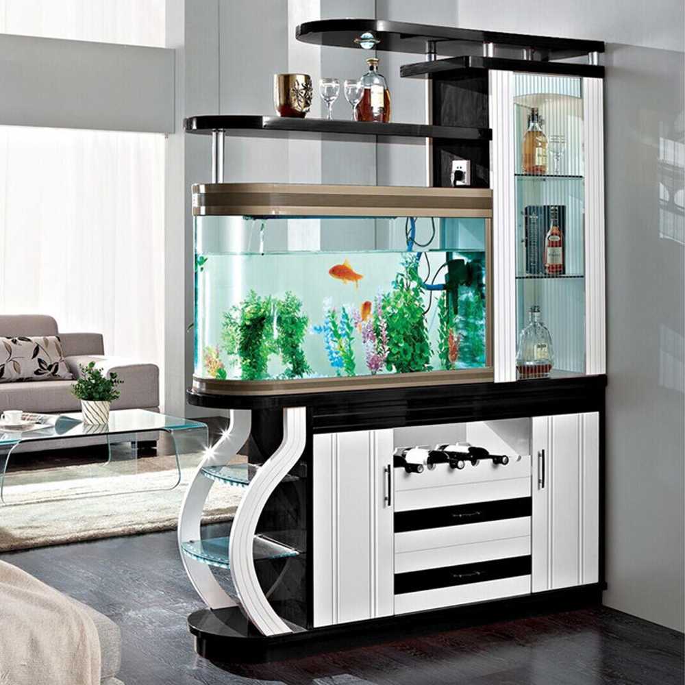 Шкаф с аквариумом выглядит очень оригинально и стильно, а также позволяет сформировать в пространстве иллюзию уединенности. Благодаря ярким растениям, рыбам и декору можно оживить блеклую цветовую палитру, расширить комнату и за счет исходящего и свободно проникающего света от аквариумной подсветки.
