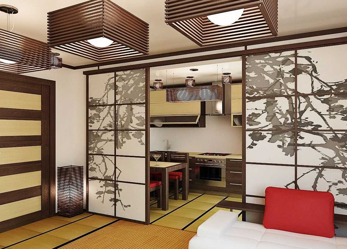 Отличие перегородки в японской однокомнатной квартире состоит в том, что полотна накладываются внахлест. Это создает лаконичный этно-дизайн.