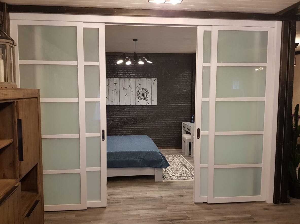 Матовые перегородки на каркасе с раздвижными дверями используют в помещениях с большой влажностью – санузле, ванной комнате, душевой.