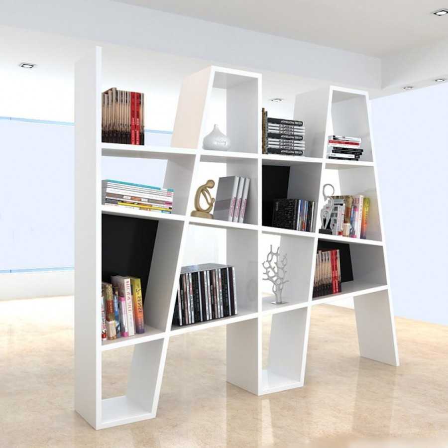- Стеллаж. Легкая конструкция, не имеющая задней стенки. Стороны изделия отделываются одинаково или в соответствии с дизайном отгороженного пространства. Разделение происходит условно, т.к. между полками остаются просветы. Плюс стеллажа-перегородки заключается в возможности свободного доступа к вещам из обеих зон. Сооружение используется для размещения книг, сувениров, посуды, цветов и аквариумов.