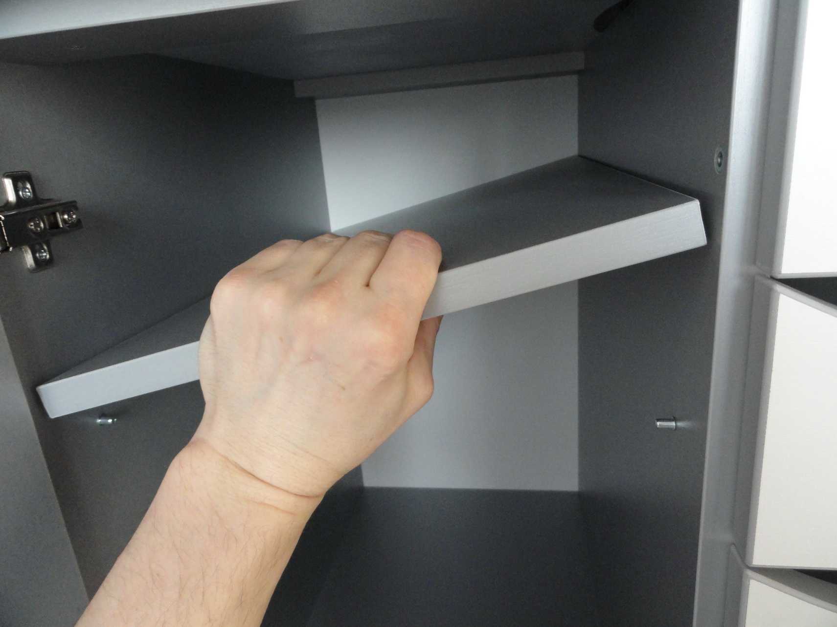 В целом, способы крепежа обусловлены общей конструкцией шкафа. Все тонкости подробно описаны в инструкции по сборке. Нет возможности рассмотреть абсолютно все способы, с помощью которых наполнение фиксируется в шкафу, так как сколько моделей шкафов, столько и способов монтажа полок, ящиков, корзин.