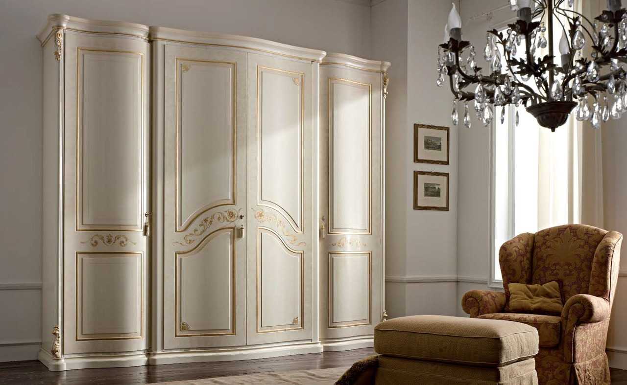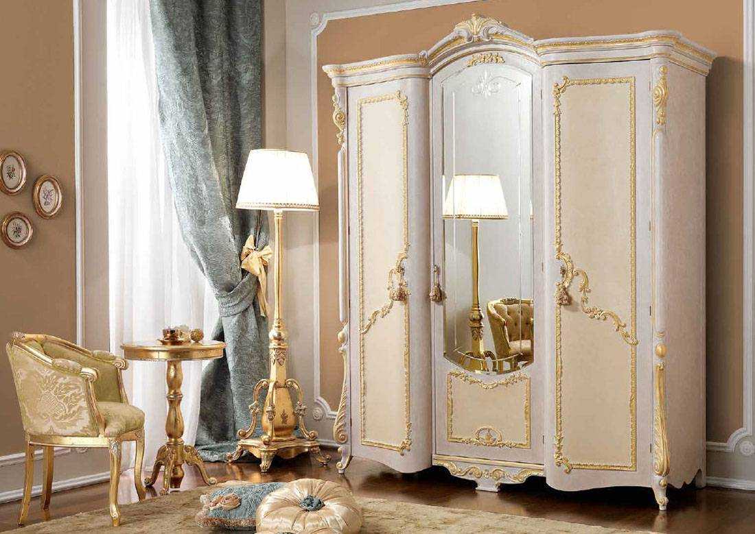 - распашные шкафы в стилях барокко или рококо выделяются изысканностью и роскошью. На фасадах дверей обязательно присутствует рельефный декор. Подобная мебель подчеркивает достаток владельца, поэтому выпуклые элементы фасада покрывают золотой краской. Резные края зеркальной вставки также обязательно украшаются позолотой. Желательно, чтобы изделия имели гнутые ножки и украшались затейливыми бронзовыми или позолоченными ручками. Мебель чаще всего выполняется в светлых тонах: белый, голубой, песочный. Для изготовления предметов используется древесина мягких пород, допускающая легкую обработку;