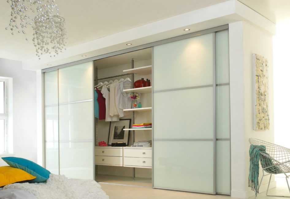 Стекло и зеркало – это популярный материал для створок гардероба. Чтобы отражающая поверхность не мешала сну, дизайнеры рекомендуют выбирать комбинированные модели из глянцевых и матовых полосок. Эффектно смотрится пескоструйное изображение, которое внешне напоминает изморозь и превращает дверцы в замороженные окна.