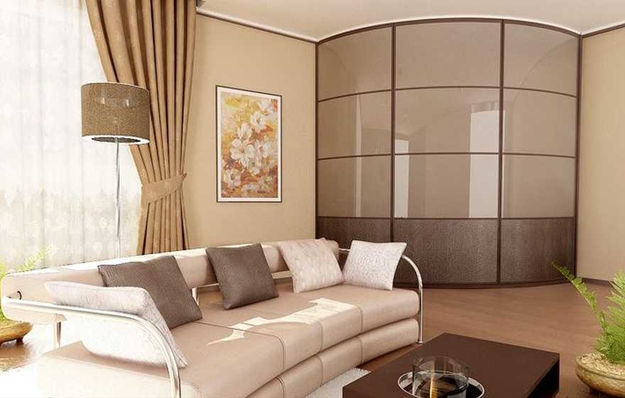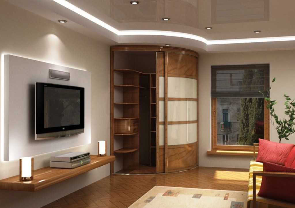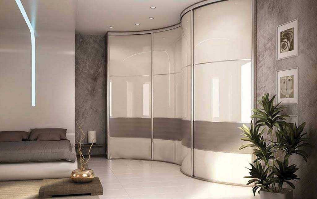 Дизайн фасадов для радиусного шкафа может быть разным. Выбор конкретной формы определяется особенностью гостиной и ее размерами: