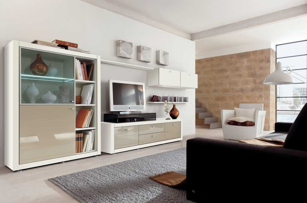 При оформлении гостиной комнаты в современном стиле стоит подбирать конструкции модульного вида так, чтобы они смогли стать удобными и функциональными. Во время установки этих конструкций их можно дополнить другими видами шкафов, к примеру, поставить рядом барный шкаф для различных напитков, а также стаканов, фужеров, рюмок.