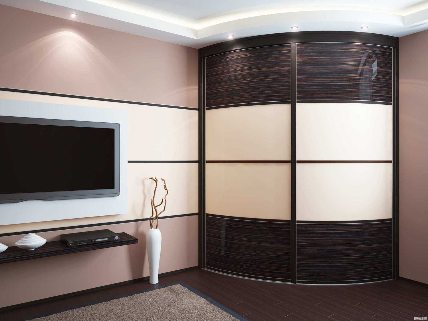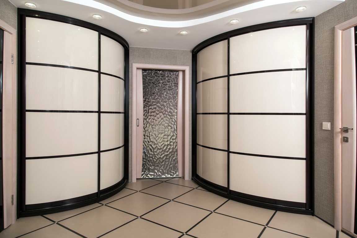 - выпуклая модель — лучше всего вписывается в небольшие прихожие, в которых нет длинных стен. Используя малый радиус изгиба фасадов, передней части шкафа придают овальную форму. Вогнутые модели устанавливают в нишах по типу встроенных конструкций;