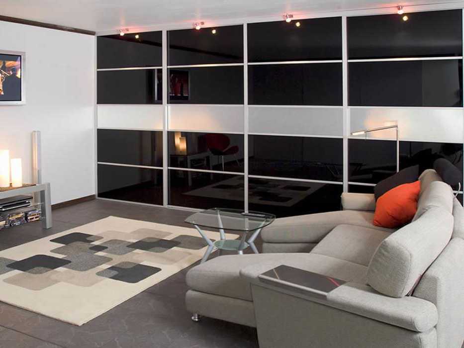 Когда такой гарнитур устанавливается в гостиной, в нем обычно хранится домашняя одежда, постельное белье, небольшая бытовая техника, рамки с фотографиями. В открытых секциях располагают домашний кинотеатр, музыкальный центр, привлекающие взгляд предметы интерьера. Количество глухих частей делают либо равным количеству зеркальных, либо меньшим.