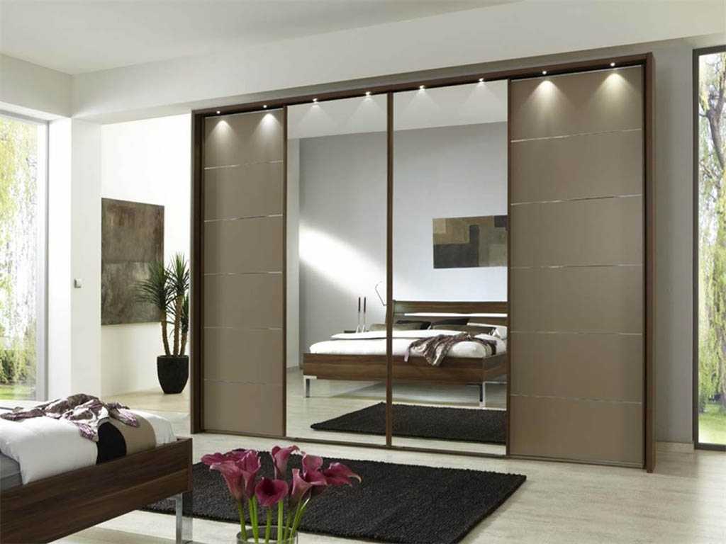 Установка шкафа в спальне производится с похожими целями и правилами, что и гостиной, но в этом варианте не оставляют открытых участков и стараются сделать максимально большие площади зеркал. Вмонтирование встроенной подсветки с неярким светом позволит создавать, при желании, уютную, интимную атмосферу, способствующую расслаблению, которая и нужна в опочивальне.