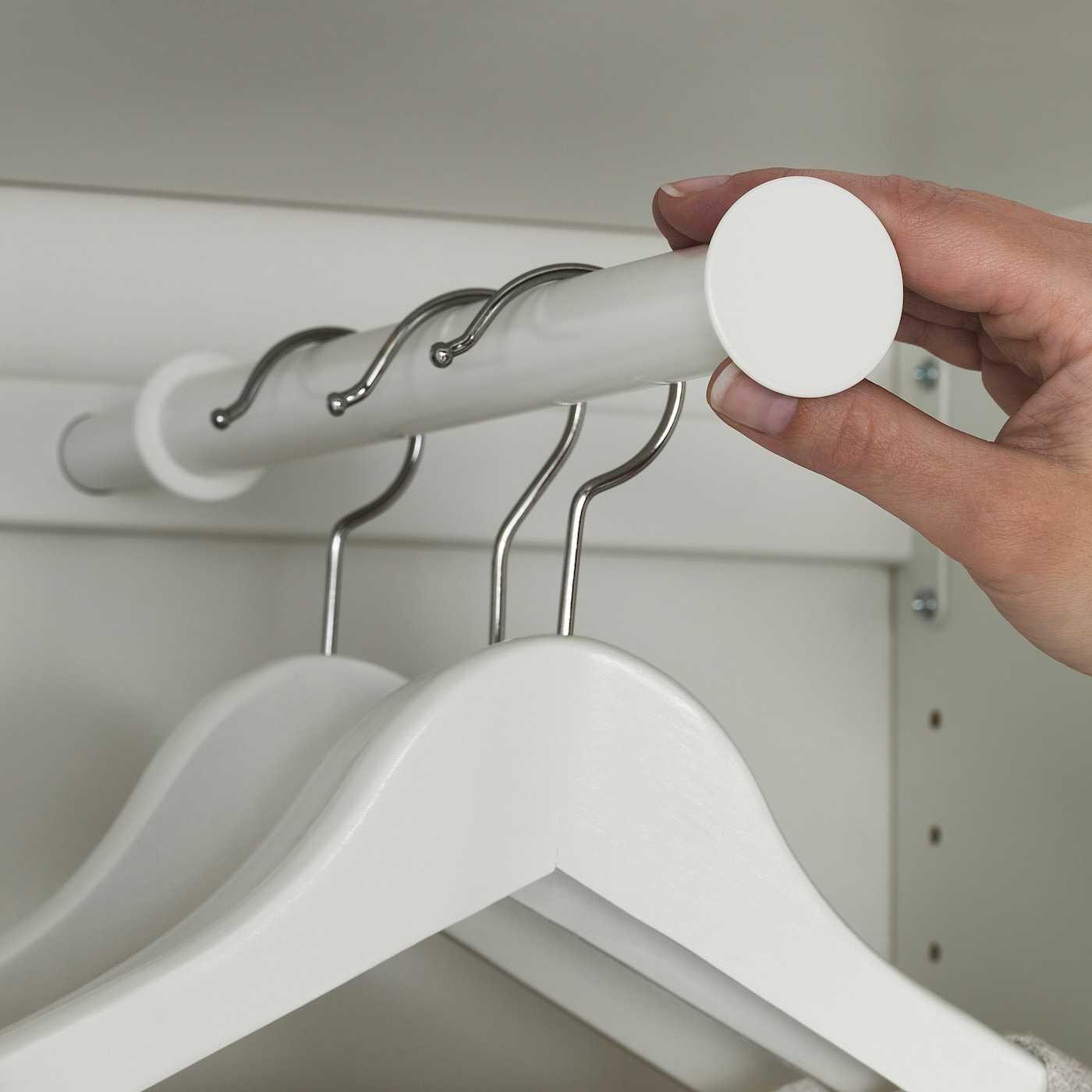 Вешалки удобно цеплять на специальные перекладины, чтобы не помялась одежда. Чем больше вещей будет висеть на плечиках, тем меньше ее приходится чистить и гладить утюгом. Исключение составляют изделия, которые быстро деформируются под весом собственной тяжести, такие лучше хранить в ящиках и комодах.