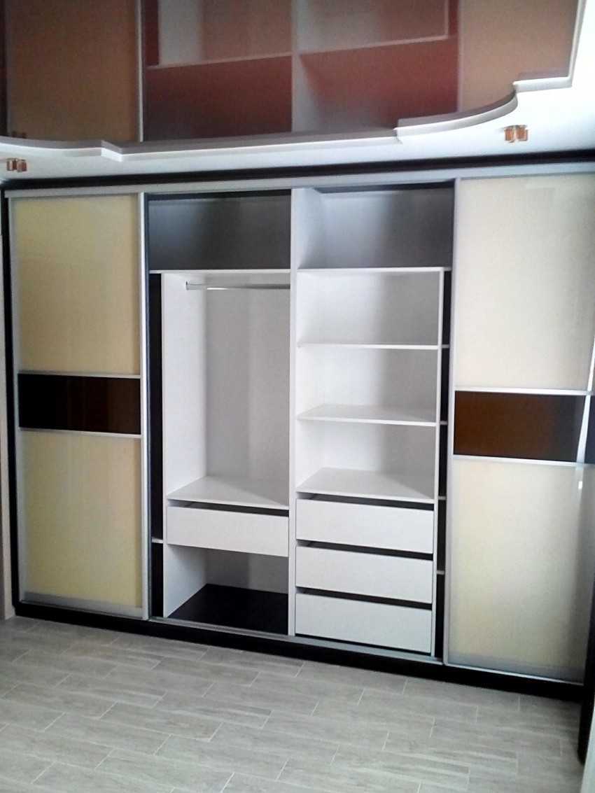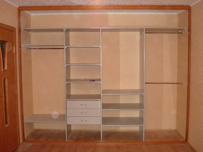 Приобретение материала на предварительной стадии. Варианты, представленные выше, подходят для изготовления встроенного шкафа-купе в прихожую своими руками. Учитывайте дизайн и условия эксплуатации, чтобы сделать правильный выбор. Вычисление параметров позволит определить, какое количество материала понадобится для работы. Будет легче создать встроенный шкаф-купе, если использовать калькулятор. Внутреннее наполнение. Здесь нужно соблюдать ценное правило: нужные и мелкие вещи должны располагаться прямо перед глазами, а ценные – в ящиках. Нежелательно устанавливать секцию для верхней одежды по центру конструкции, так как влажность от нее разойдется в стороны. Лучше встраивать ее с боковой стороны, чтобы влажность естественным способом просачивалась наружу. Изготовление своими руками проекта дверей, которые считаются наиболее важными элементами конструкции. Сначала нужно решить, сколько створок будет, какую ширину двери должны иметь, какую конструкцию подвеса выбрать. Ширина двери должна быть такой, чтобы перехлест не превышал 50-70 см. Не стоит экспериментировать с размерами, в противном случае при использовании двери могут возникнуть затруднения. Выбор способа подвески. На сегодняшний день существует несколько вариантов: двухрельсовая с нижней опорой, двухрельсовая с опорой, располагающейся сверху, и монорельсовая. Выбор схемы размещения полок, расчет их длины и глубины. Для встроенного шкафа не подходят те же варианты подвесок, что и для корпусных видов мебели. Будет рациональнее встроить в нишу прочный каркас, однако, это довольно сложная и затратная процедура. Проще воспользоваться специальной системой настраиваемой подвески. Ее применение существенно облегчает задачу мастеру, который планирует сделать встроенный шкаф-купе своими руками. Если расчет – слишком сложная задача, то ему стоит выбрать готовую систему. Подготовительные работы, проводимые над нишей. Измерение габаритов и создание схемы. Здесь рассчитываются базовые параметры, на основе которых делаются чертежи шкафа-купе, оснащенного небольшими шкафчиками. Если вы планируете сделать купе, размеры должны быть указаны под каждым элементом