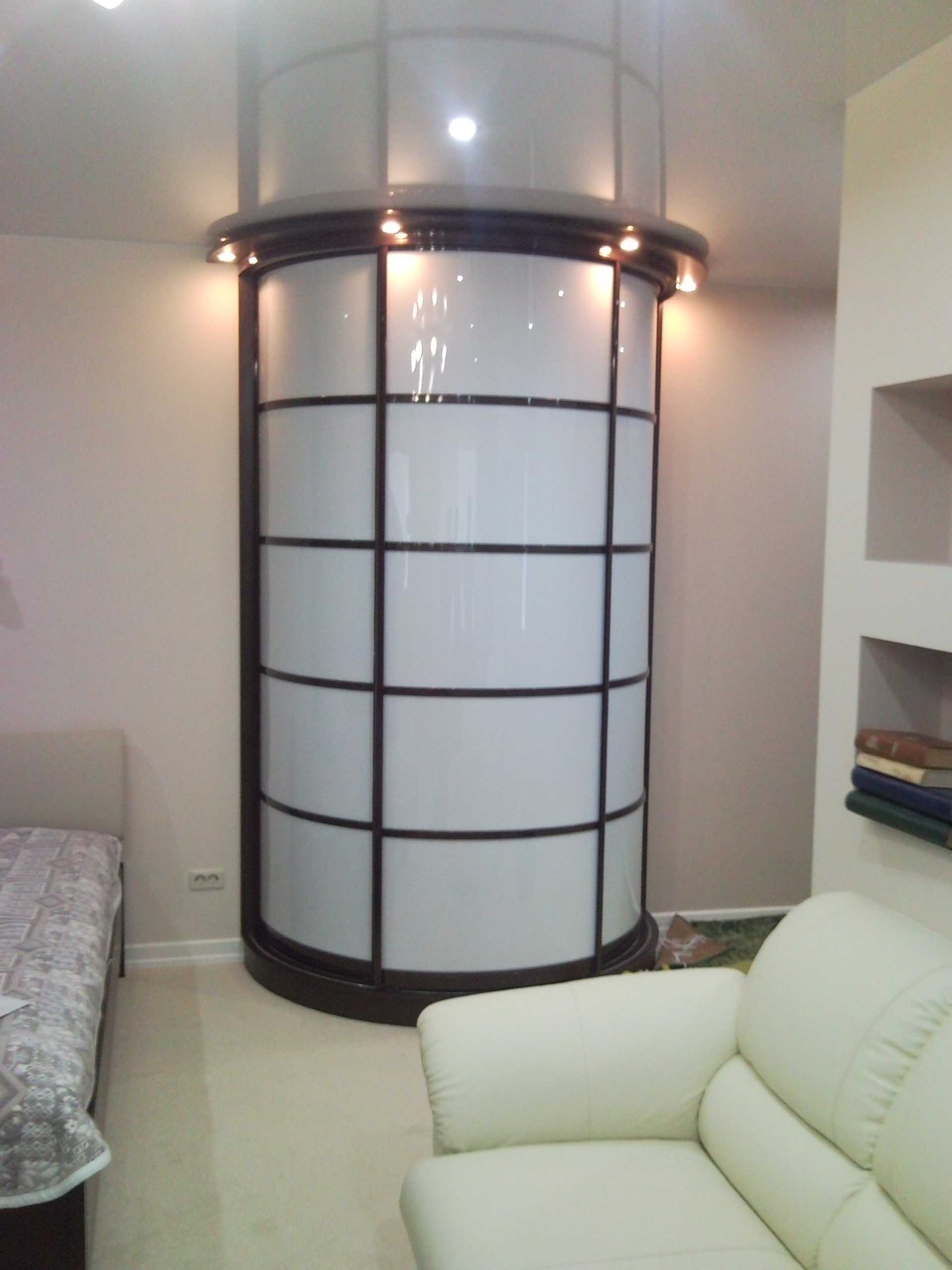Благодаря изогнутой форме, характеризуются большей вместительностью. Дверки изготавливаются выпуклыми, повторяют периметр и сдвигаются по сектору окружности. Радиусные шкафы смотрятся необычно, небольшие угловые конструкции с равными стенками напоминают душевые кабины. Однако есть интересные дизайнерские решения, совмещающие прямые и вогнутые формы, что в совокупности с правильно подобранным материалом дает достаточно впечатляющие результаты.