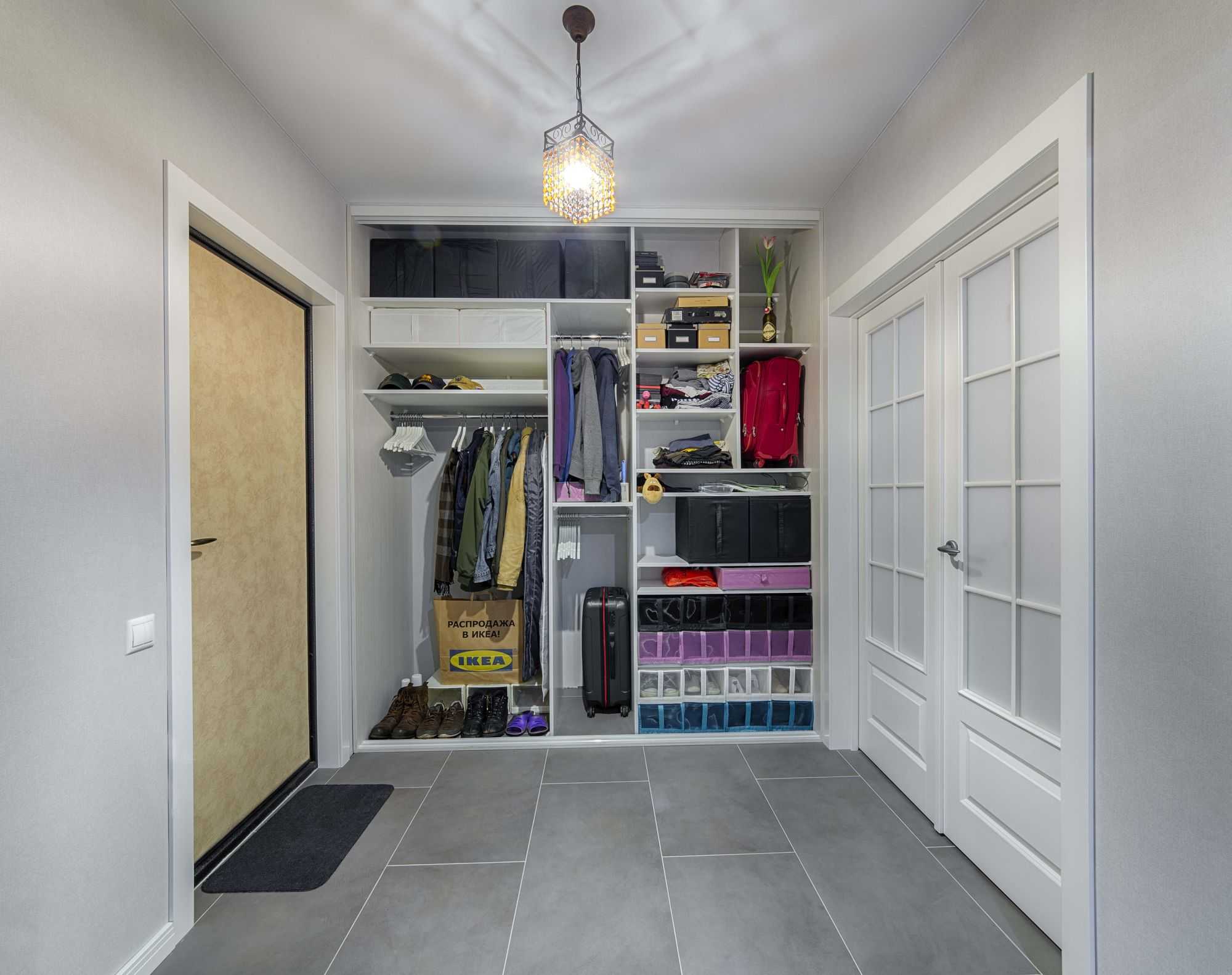 прихожая — отличается ограниченным пространством, шкаф удобно устанавливать во внутренней нише, углу. Можно разместить вещи в шкафу купе, встроенном в нишу. Обязательные элементы при наполнении: секция для зимней одежды, полки для головных уборов, зонтов, аксессуаров, обувные корзины, ящики, зеркальные дверцы, тумба для сидения, шкафчики для мелочей (ключи, обувные кремы, щетки).